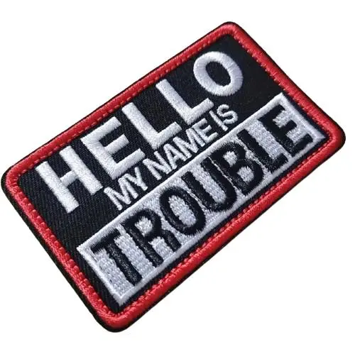 • Tekst: “Hello my name is trouble” humoristisch en herkenbaar